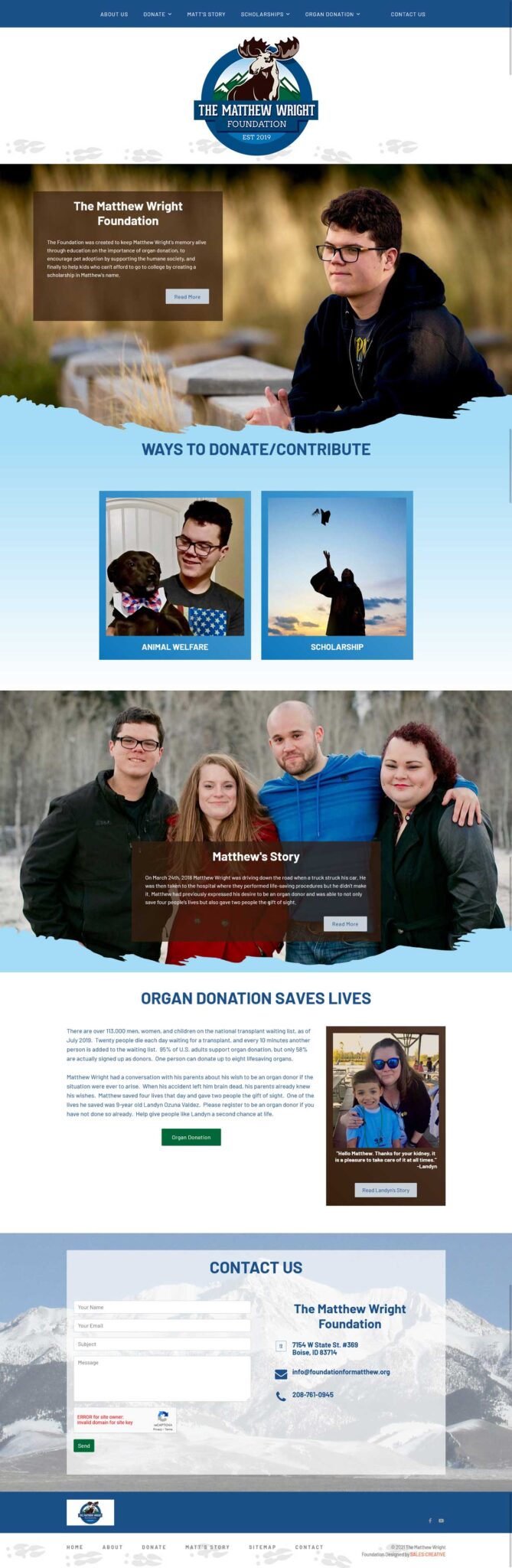 The final result was a respectful and cohesive brand identity that effectively communicates The Matthew Wright Foundation’s mission to honor Matthew Wright’s memory through organ donation, animal welfare, and education. The new logo, business cards, and website have received positive feedback from the community, helping the foundation establish a stronger, more unified presence.